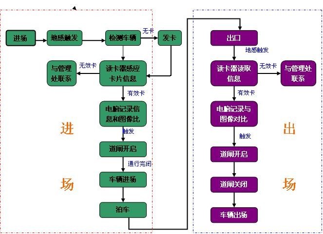 当车辆进入读卡区域时通过地感触发读写器读卡并判断车辆信息,识别卡与系统登记卡进行匹配,若有效则开道闸并开启摄像机拍下车辆信息,在电脑里记录通过时间和图像比对,车辆通过,车辆离开工作区道闸关闭;若卡无效则与管理处联系,发临时卡或补交费用。